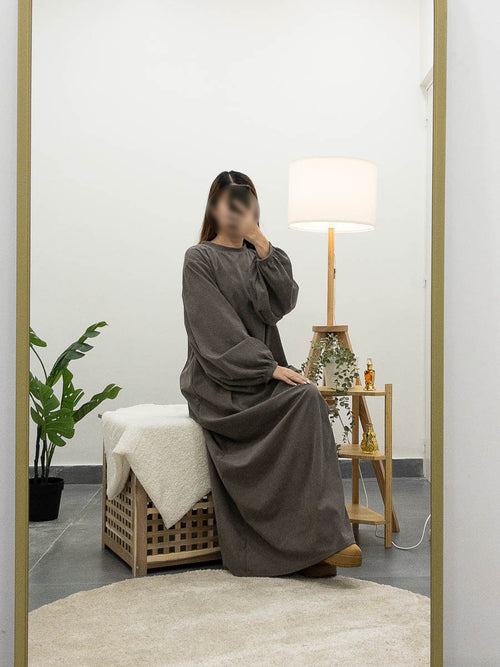 Loose-fitting cotton dress with round neck and long sleeves, one size